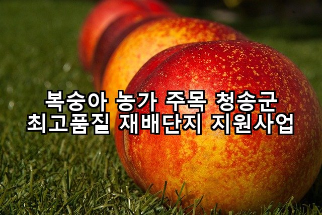 청송군, 최고품질 복숭아의 미래를 그리다 청정 자연의 고장, 청송에서 최고 품질의 복숭아를 생산하고 계시는 농가 여러분께 반가운 소식을 전합니다. 청송군은 지역 복숭아 산업의 경쟁력을 강화하고 농가 소득 증대에 기여하기 위해 ‘최고품질 복숭아 재배단지 조성 지원사업’을 적극 추진하고 있습니다. 이 사업은 단순히 생산량 증대를 넘어, 소비자에게 신뢰받는 안전하고 맛있는 복숭아를 공급하며 청송 복숭아의 위상을 한 단계 … 더 읽기